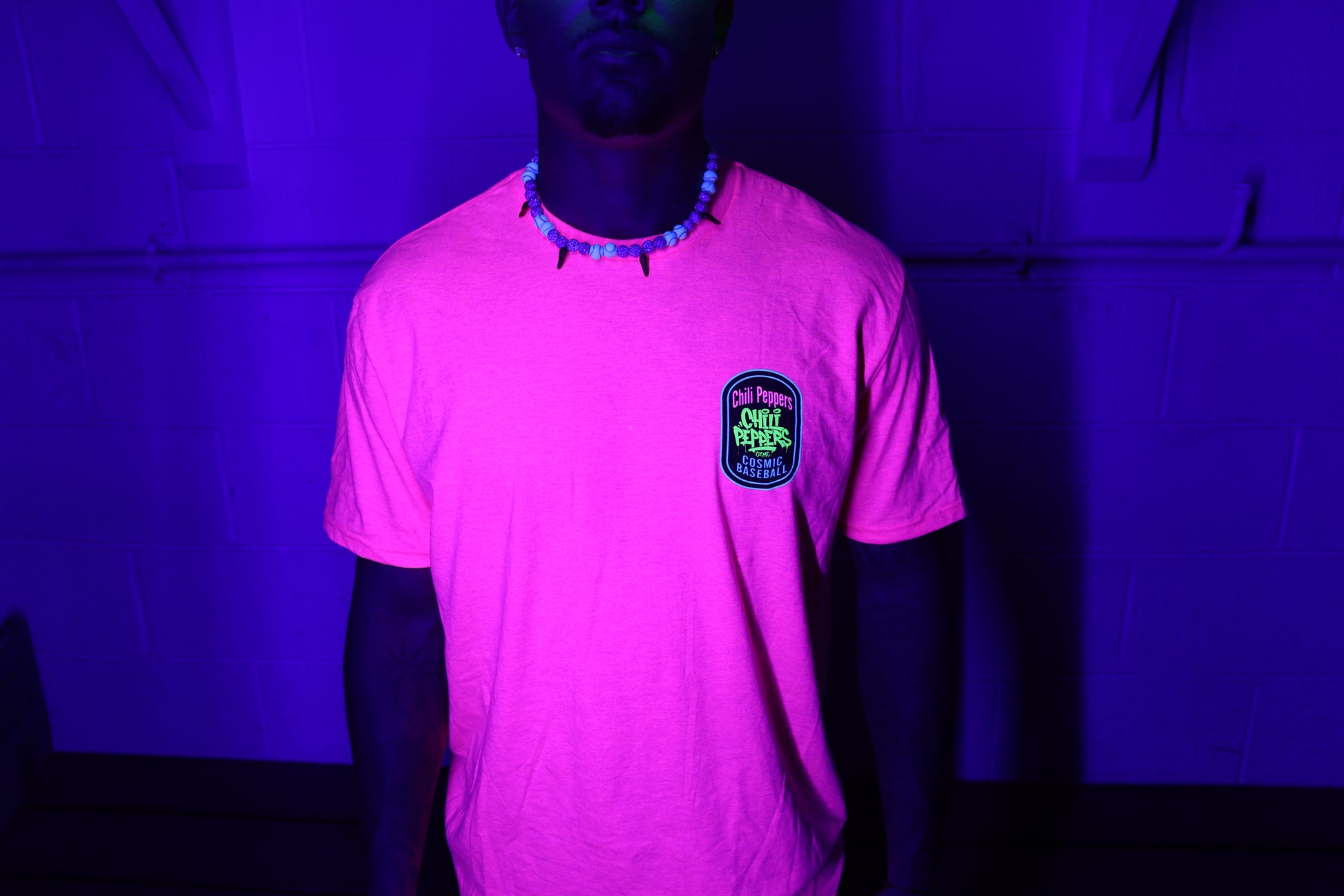The perfect Christmas gift for all Cosmic Baseball fans! Get your custom pink stocking filled with one cosmic baseball, one Chili Peppers t-shirt, Chili Peppers and Glow Mojis sticker, your choice of a Chili Peppers or Glow Mojis team poster, and your choice of ONE out of four different cosmic mini bats.